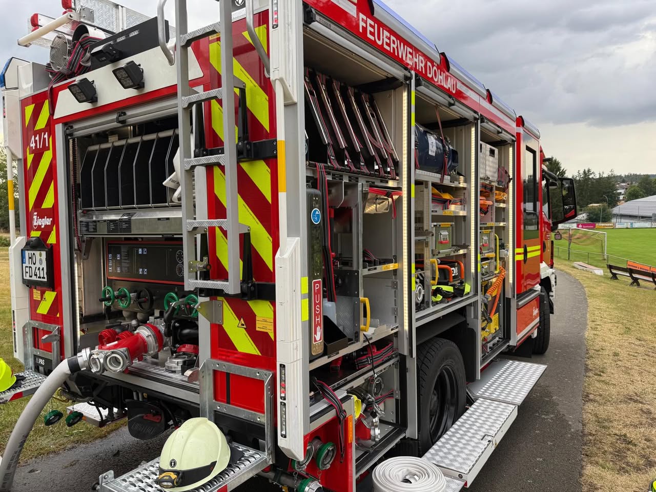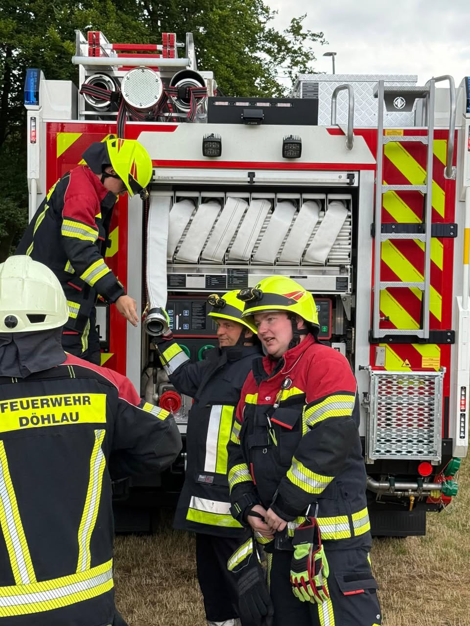 Sie haben das neue Auto bis ins Detail inspiziert, um die verladenen Gerätschaften und ihren Platz im Auto kennenzulernen. Des Weiteren gab es eine Einweisung in die Pumpen des Autos.